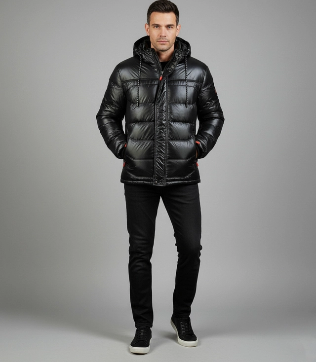 Men's winter quilted jacket with hood and sheen