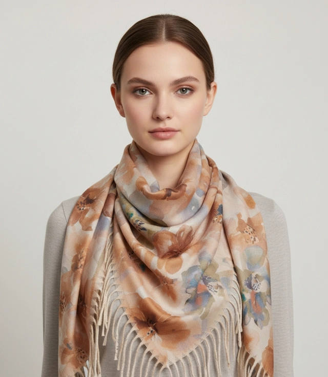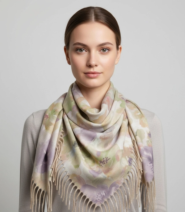 Women's scarf with watercolor delicate pattern and tassels