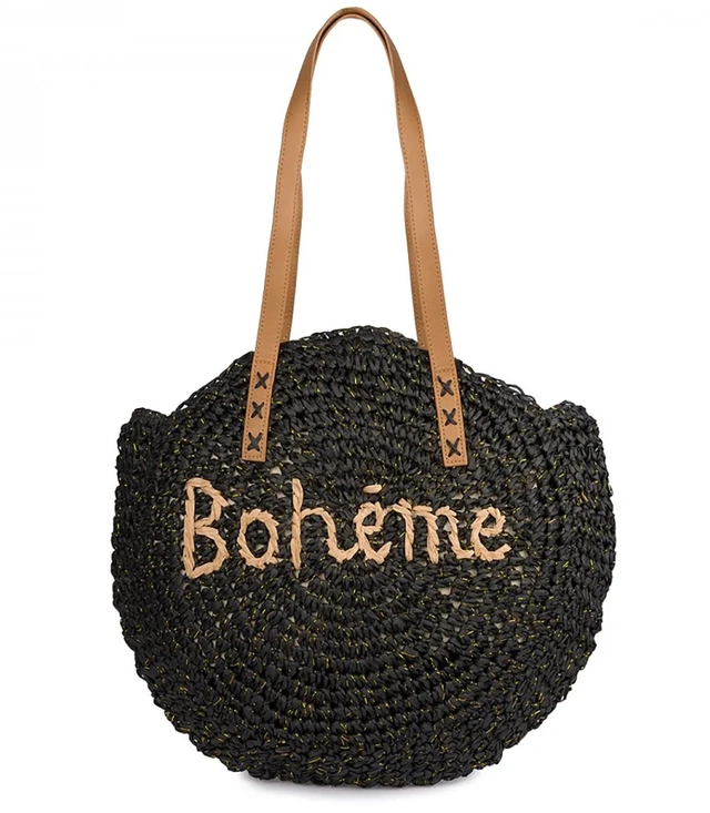 Okrągła torebka boho z plecionki z napisem „Bohème”