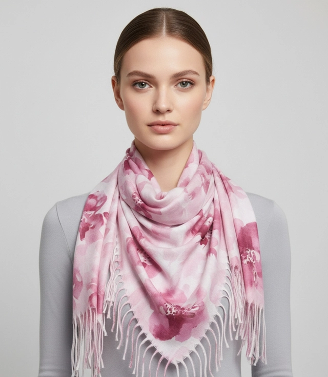 Kobieca chusta szal z akwarelowym delikatnym wzorem i frędzlami