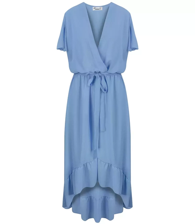 Długa sukienka MAXI z falbanami – zwiewna, kopertowa, wiązana