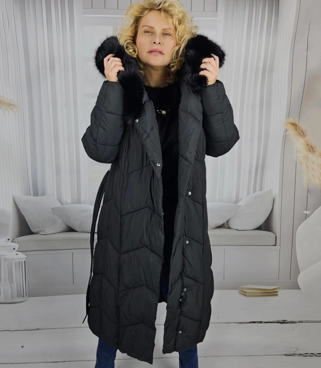 Długi pikowany płaszcz zimowy ciepły z kapturem KELLY