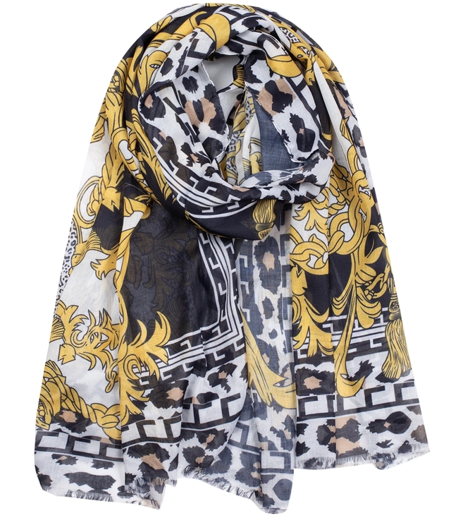 Elegancki dwustronny szalik z złotą nitką i roślinnym wzorem