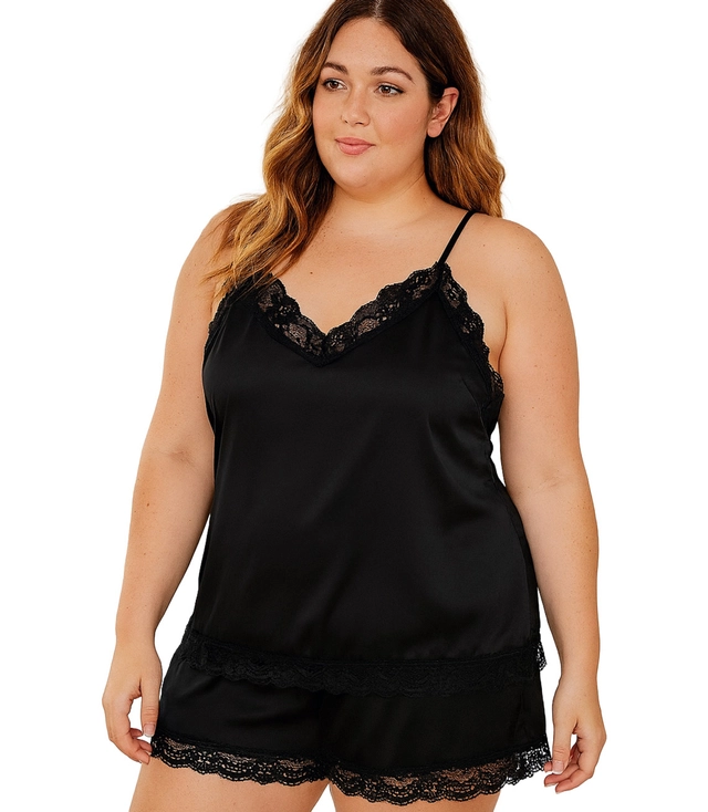 The set consists of a top with thin straps and short shorts decorated with subtle lace.