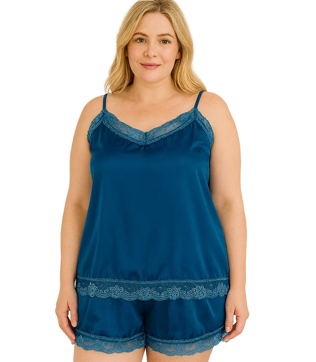 The set consists of a top with thin straps and short shorts decorated with subtle lace.