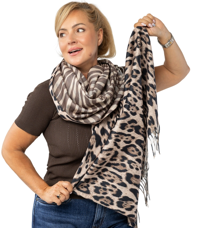 Safari scarf is an ideal choice for women who like to combine comfort with a fashionable look. Two-sided pattern - leopard and zebra - allows you to quickly change your styling depending on your mood. Soft material and tassels add to its charm, while making it a practical and stylish everyday accessory.