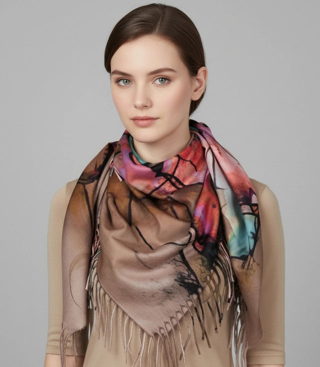 Abstract shawl scarf multicolor elegant with tassels is a combination of lightness, style and comfort. Its abstract pattern will add character to any styling, and the soft fabric will pleasantly wrap you up on colder days. It's a fashionable and versatile accessory that will work for both casual and elegant ensembles.