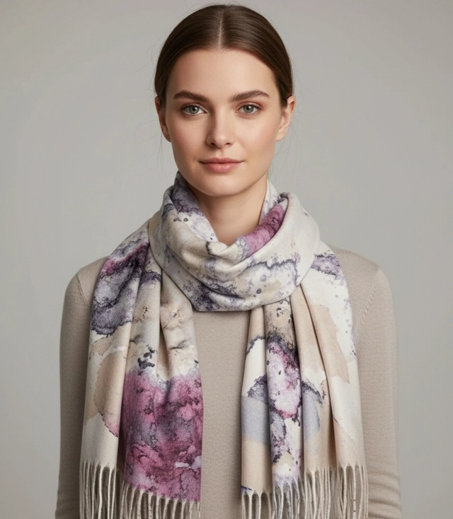 Women's scarf with watercolor delicate pattern and tassels is a combination of style and functionality. Its artistic pattern and light tassels will make any styling unique. Perfect for autumn and winter - a must-have in a woman's closet.