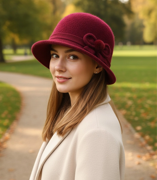 This cloche hat impresses with its soft, elegant finish and decorative bow that adds a girly charm. It is ideal for walking, urban styling and cooler days. A timeless and extremely feminine accessory.