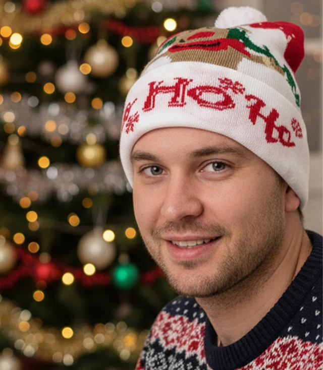 This adorable Christmas hat with a soft pom-pom is an accessory that instantly puts you in the magical mood of December days. Its pleasant-to-the-touch knit fabric keeps you warm even in the harshest of frosts, and its festive character makes it perfect for strolling through markets, family photos or preparing for Christmas Eve.