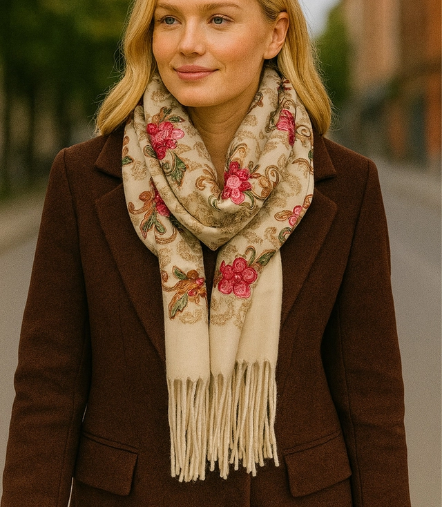 The scarf has a subtle folk floral pattern all over it, which catches the eye and adds an ethnic touch to styling. The decorative tassels emphasize femininity and give the whole thing a casual, boho vibe. Thanks to its universal dimensions, you can wear it as a shawl for a coat, a bedspread for a dress or a striking shoulder wrap.
