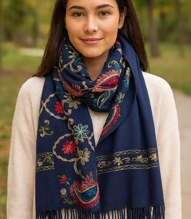 The 180 x 70 cm size allows it to be worn in many ways: classically wrapped around the neck, as a chic shoulder surplice or a lightweight shawl replacing an outer garment during evening outings. The tassels subtly emphasize the feminine character, and the rich floral motif with decorative swirls gives the whole an elegant, slightly ethnic look.
