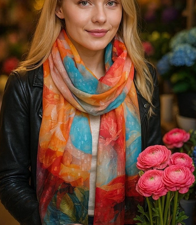 The stylish floral motif with flowers and butterflies adds a romantic touch to the styling and attracts attention, and the elongated shape of the scarf allows for a variety of ways to tie it - from the classic wrap around the neck, to wearing it on the shoulders like an elegant shawl. This is a versatile accessory for the transitional season and winter days, which will also work well as an elegant gift for her.