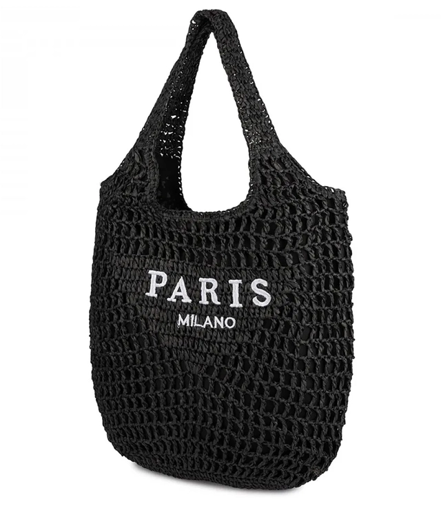 Ta pleciona torebka z wyrazistym napisem „PARIS MILANO” to idealny wybór na lato – uniwersalna, wygodna i stylowa.