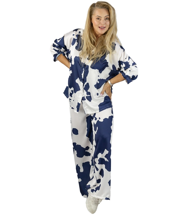 Modny zestaw satynowa koszula i spodnie w krowi print SLOANE