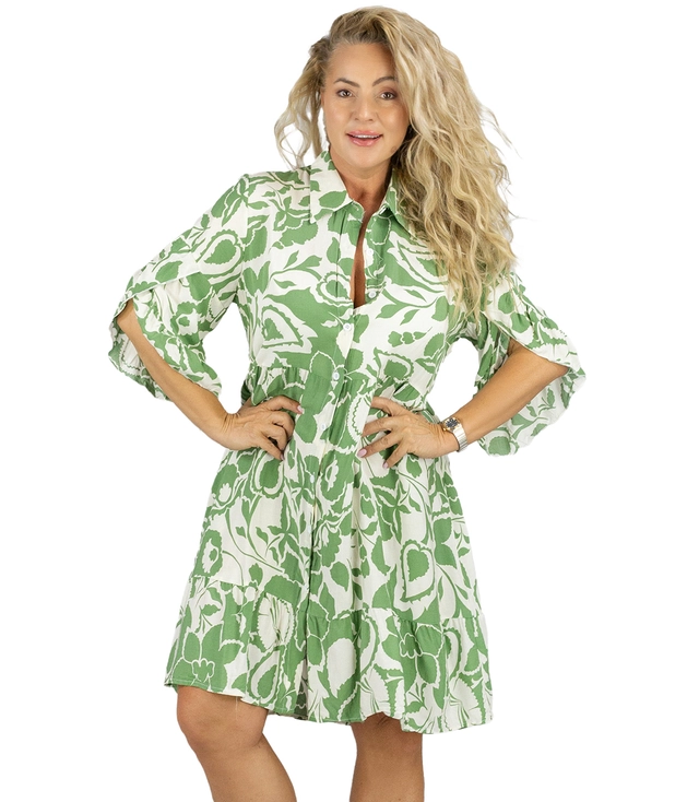 Dekolt z kołnierzykiem i subtelne rękawy z rozcięciem dodają stylu i elegancji.