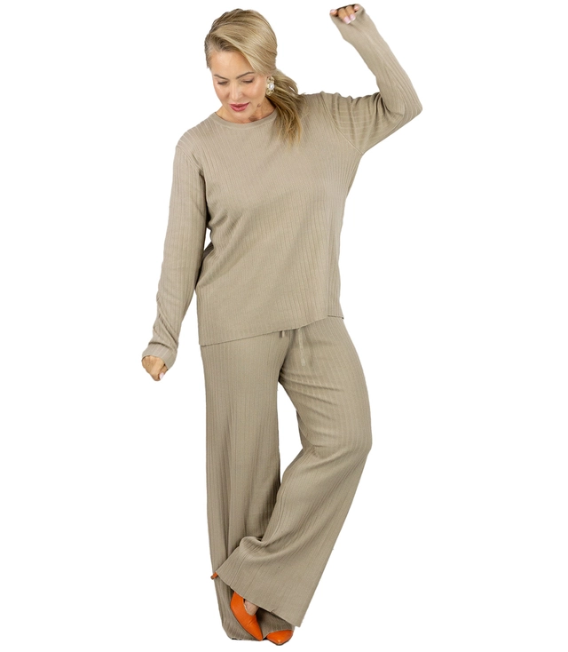 Zestaw SORELLA składa się z miękkiej, prążkowanej bluzy z długim rękawem oraz spodni o luźnym kroju z elastyczną talią i wiązaniem.