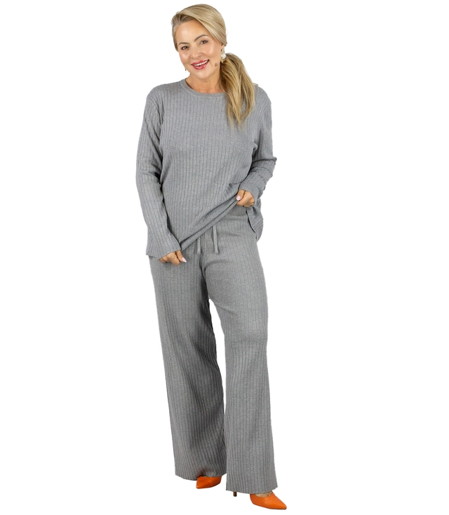 Zestaw SORELLA składa się z miękkiej, prążkowanej bluzy z długim rękawem oraz spodni o luźnym kroju z elastyczną talią i wiązaniem.