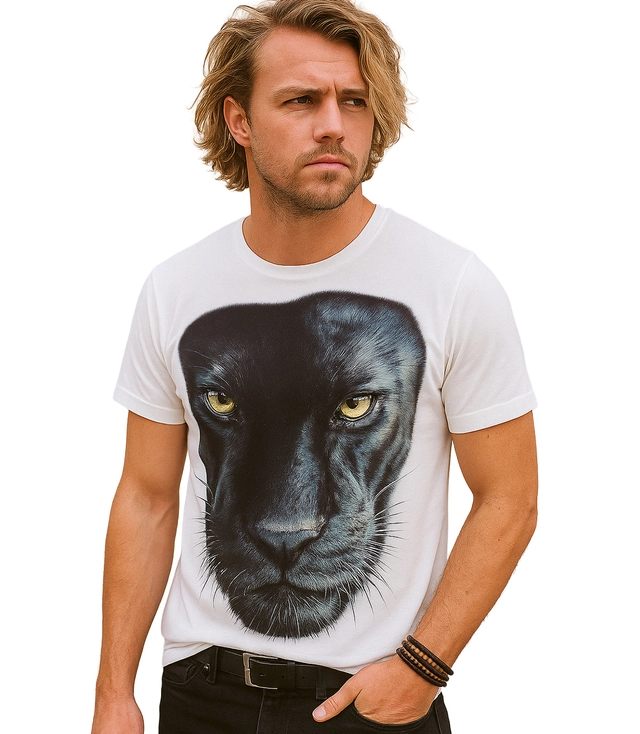 Przyciągająca wzrok męska koszulka z realistycznym nadrukiem pantery na całym froncie.