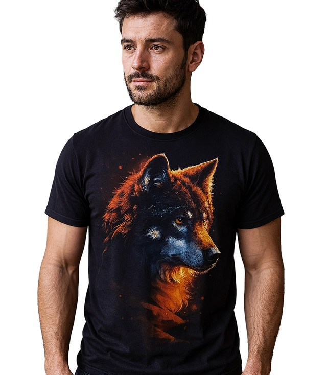 Stylowa męska koszulka z efektownym nadrukiem głowy wilka w intensywnych kolorach.