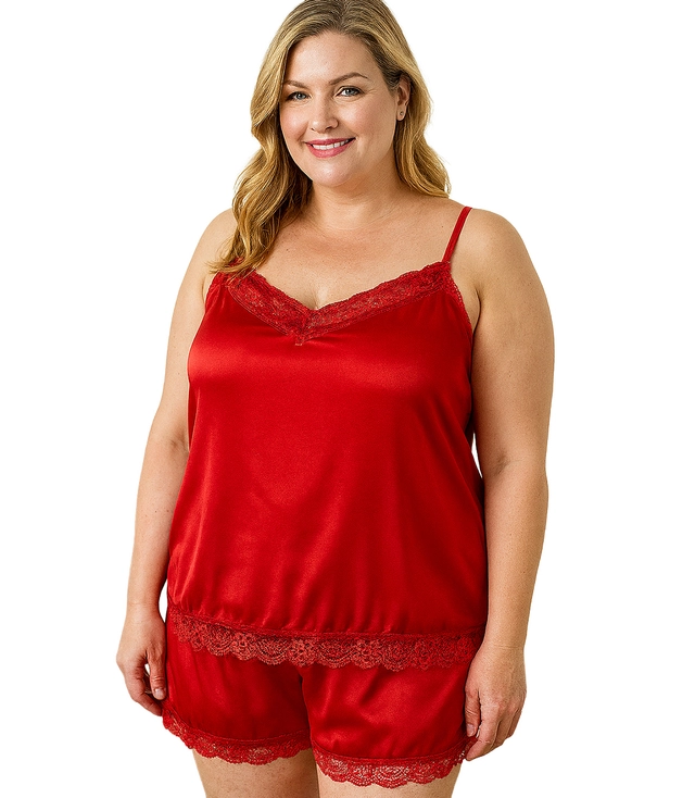 Satynowy komplet piżamowy z koronką spodenki top halka