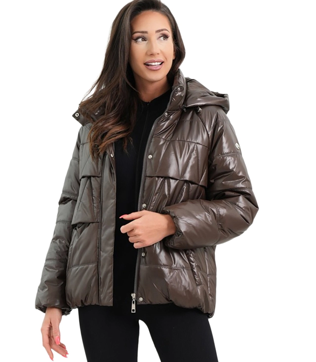 Stylowa kurtka zimowa o modnym oversizowym kroju. Ma grube wypełnienie zapewniające ciepło w chłodne dni i wodoodporną powierzchnię chroniącą przed opadami.