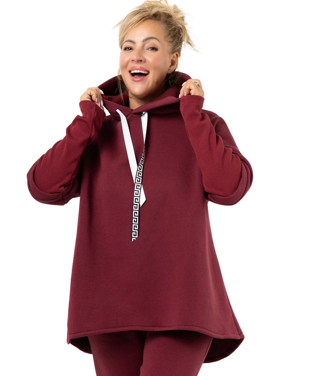 Bluza "Veronica" to kwintesencja luksusu w wydaniu sportowym. Jej obszerny fason zapewnia pełen komfort i swobodę ruchu, a jednocześnie wygląda niezwykle stylowo. Unikalne sznurki z motywem meandra nadają bluzie charakteru, pozwalając na szybkie przejście od casualowego luzu do bardziej stylowego outfitu.