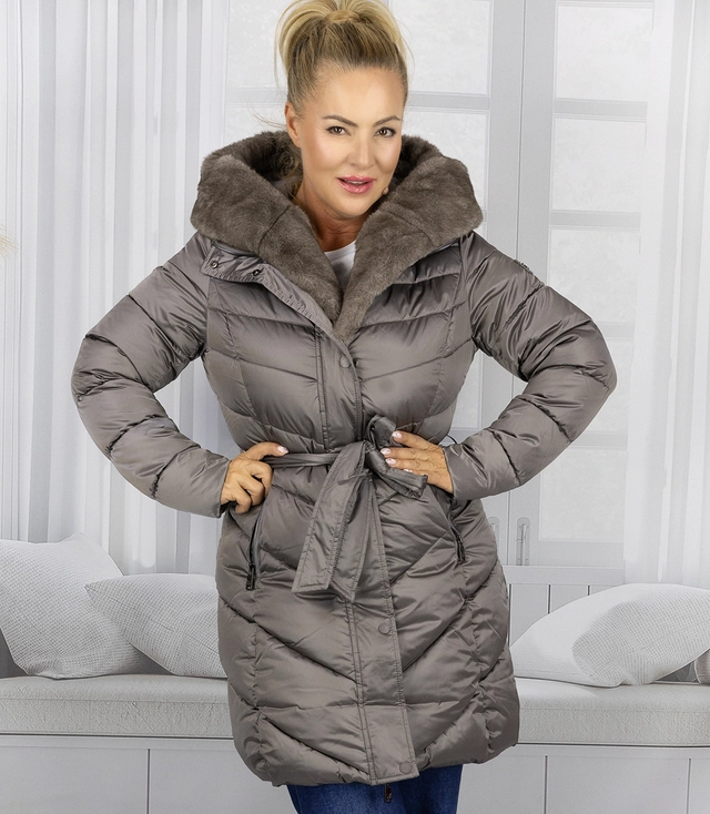 Płaszcz "DIVA" to połączenie wyrafinowanej elegancji z funkcjonalnością zimową. Geometryczne pikowanie i możliwość podkreślenia talii sprawiają, że nawet w ciepłym okryciu wierzchnim możesz wyglądać zjawiskowo. Futrzany kołnierz otula szyję, zapewniając zarówno ciepło, jak i luksusowy wygląd.