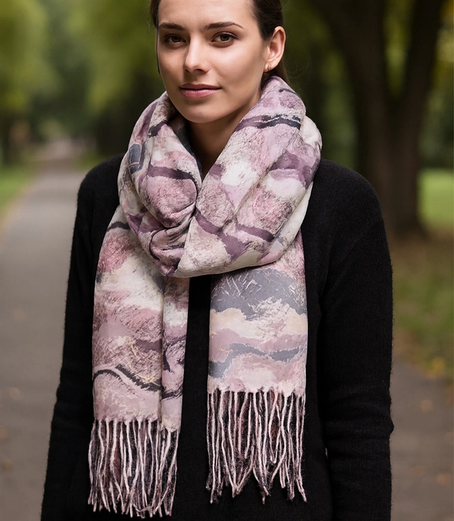 Stylowy szal wykonany z miękkiej, przyjemnej w dotyku tkaniny. Delikatny wzór przypominający fale lub szlaczki nadaje mu wyjątkowego, dekoracyjnego charakteru.