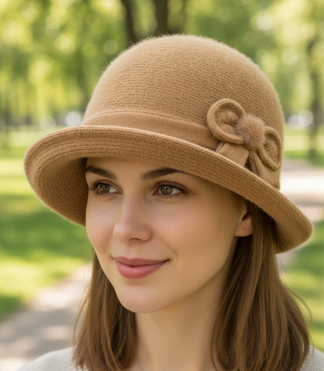 Ten kapelusz typu cloche zachwyca swoim miękkim, eleganckim wykończeniem oraz ozdobną kokardą, która dodaje mu dziewczęcego uroku. Idealny na spacery, miejskie stylizacje i chłodniejsze dni. Ponadczasowy i niezwykle kobiecy dodatek.