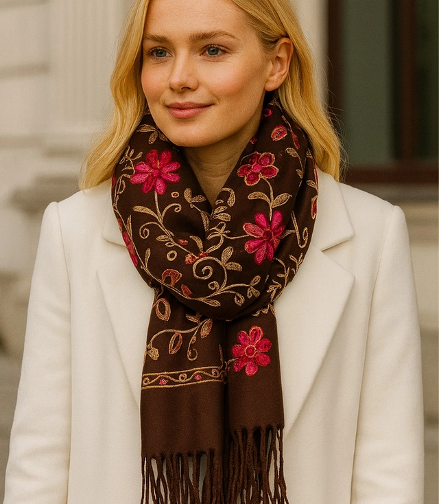 Szal ma na całej powierzchni subtelny, folkowy wzór kwiatowy, który przyciąga wzrok i dodaje stylizacjom etnicznego charakteru. Dekoracyjne frędzle podkreślają kobiecość oraz nadają całości swobodny, boho klimat. Dzięki uniwersalnym wymiarom możesz nosić go jako szal do płaszcza, narzutkę do sukienki lub efektowną chustę na ramiona.