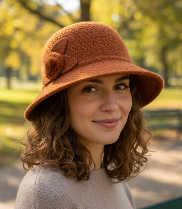 Warm women's cap with colorful pom-pom in winter pattern autumn winter
