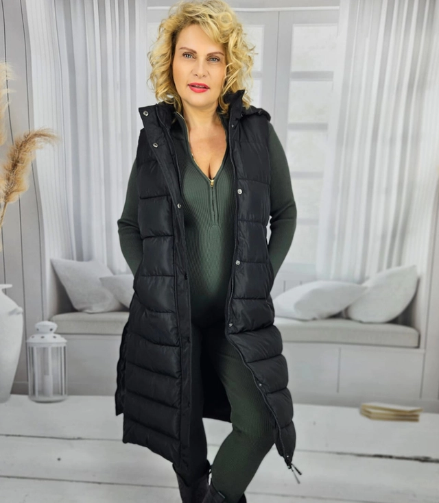 Długi damski bezrękawnik kamizelka pikowana z kapturem TORI