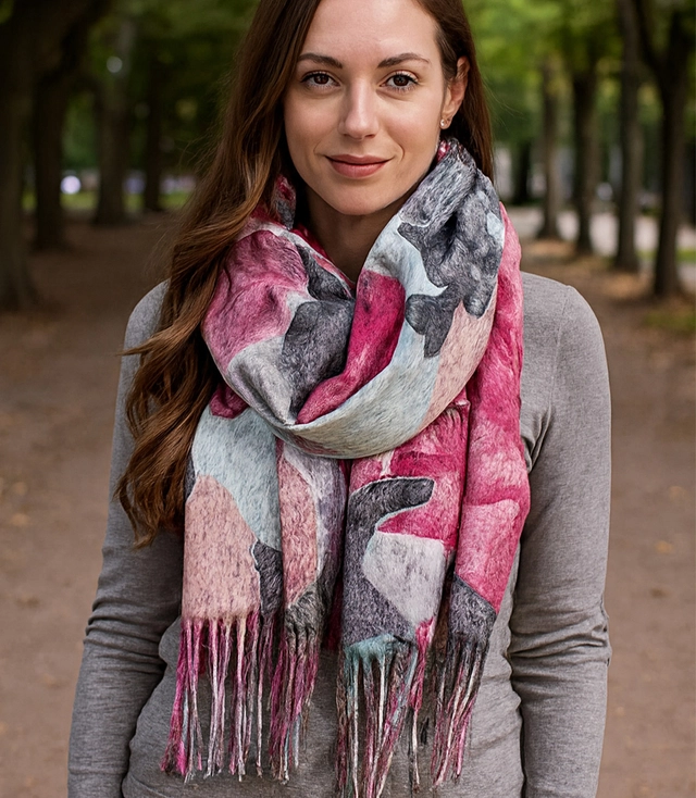 Szal damski z motywem roślinnym i frędzlami elegancki